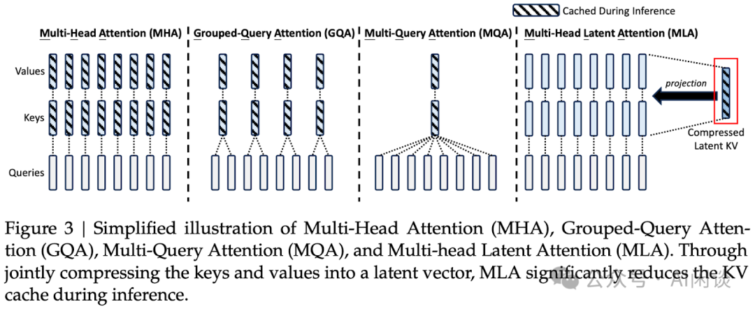 MLA:DeepSeek 2024 年 5 月在 DeepSeek V2(DeepSeek-V2: A Strong, Economical, and Efficient Mixture-of-Experts Language Model)中提出,并在 DeepSeek V3 ([2412.19437] DeepSeek-V3 Technical Report)中沿用。核心思路是每个 Head 都有独立的 K 和 V,但它们可以投影和反投影到同样的、共享的 Latent KV。