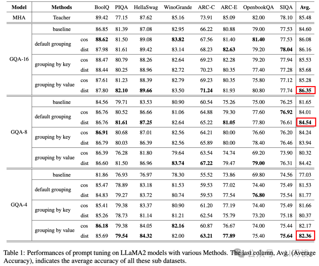 2.2.2 MHA -> GQA/MLA 模型在预训练阶段已经确定好是 MHA,还是 GQA、MLA。考虑到 GQA 和 MLA 在 Inference 阶段的优势,也就衍生了一系列将 MHA 转为 GQA、MLA 或者将 GQA 转为 MLA 的方案(PS:这些方案和预训练没有太大关系,更多是对 Inference 的帮助,不过这里也简单介绍)。 如下图 Table 1 所示,在 [2412.20677] Align Attention Heads Before Merging Them: An Effective Way for Converting MHA to GQA 中作者提出了将 MHA 转换为 GQA 的方案。其在 LLaMA2 7B 上做实验(共 32 个 Attention Head ):