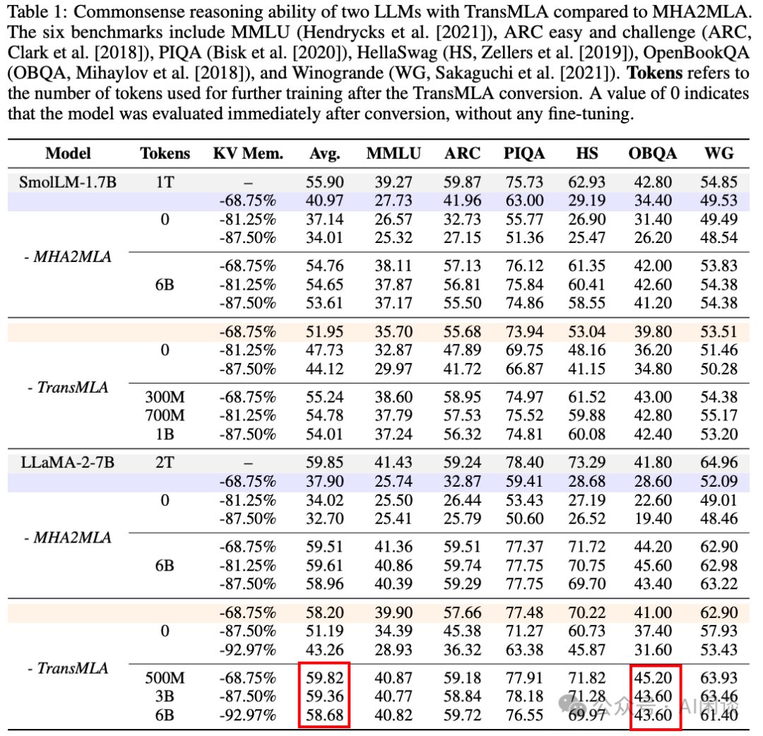 如下图 Table 1 所示,在 [2502.14837] Towards Economical Inference: Enabling DeepSeek's Multi-Head Latent Attention in Any Transformer-based LLMs 中,作者进一步探索了 MHA/GQA 到 MLA 的转换(PS:其实 GQA 可以看做 MHA 的特例,因此如果支持 MHA 转 MLA,就很容易支持 GQA 转 MLA)。