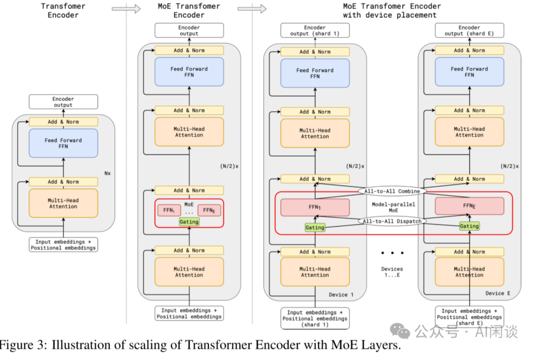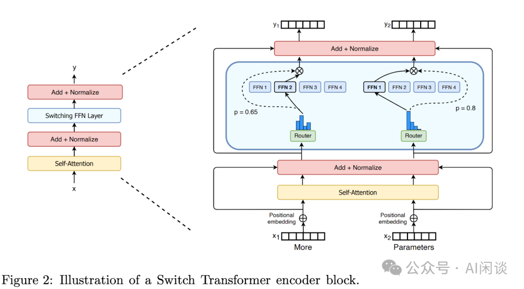 在 DeepSeek MoE 阶段(24 年 1 月),细粒度 MoE 还没被广泛接受(当模型规模不大时,细粒度 MoE 对训练性能影响较大)。直到 DeepSeek V2(DeepSeek-V2: A Strong, Economical, and Efficient Mixture-of-Experts Language Model)甚至是后续的 DeepSeek V3([2412.19437] DeepSeek-V3 Technical Report),这种细粒度专家和共享专家的方式的方式才被广泛接受并得到大规模使用。 2.3.3 Dense + MoE 除了 Softmax Attention 与 Linear Attention 的混合架构外,也有一些 Dense 模型和 MoE 模型的混合架构。这种方式最早出现在 Google 经典的 Switch Transformer模型中([2101.03961] Switch Transformers: Scaling to Trillion Parameter Models with Simple and Efficient Sparsity),其同样是 MoE 相关工作中非常经典的 Paper。如下图 Figure 2 所示,单看架构图很容易误解为是一个纯粹的 MoE 模型(每一个 Transformer Layer 都包含 MoE Block),一些非官方的代码实现中也是如此。然而,实际上该模型是一个混合架构模型。