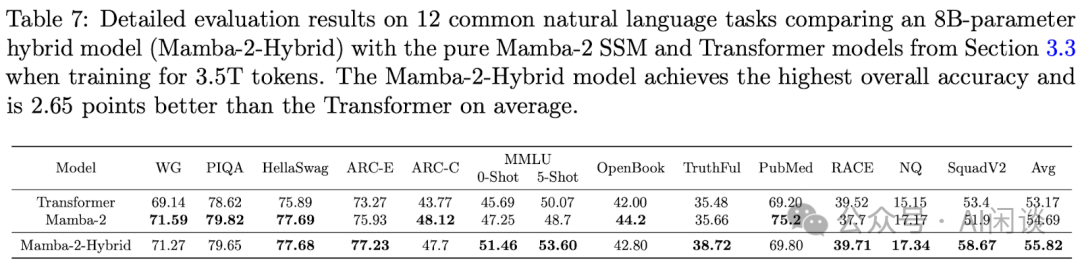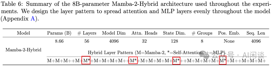 除了 MiniMax 和 Hunyuan 外,NVIDIA 也发表过基于 Mamba 的混合模型 Mamba-2-Hybrid 8B([2406.07887] An Empirical Study of Mamba-based Language Models),其混合结构如下图 Table 6 所示,共 28 个 Attention Layer,其中: