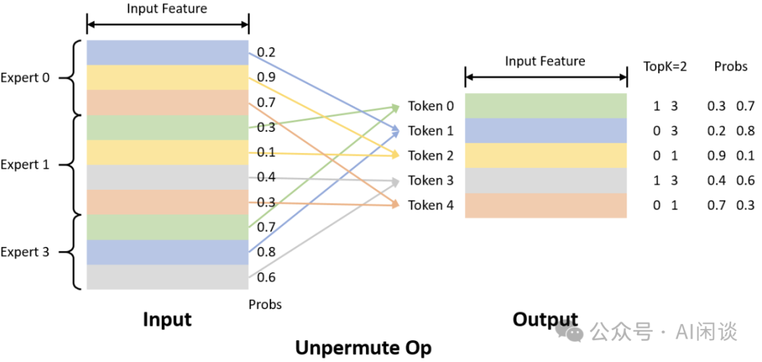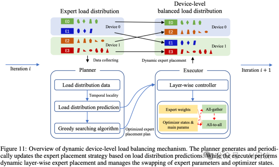 5.6.2 预训练优化 W300A47 LLM 预训练的分布式策略为 21DP(ZeRO-1)、8EP(Attention 8TP)、12PP,共 2016 H800 GPU,Global Batch Size 15120,GPU 之间使用 RoCE NIC,MFU 达到 47%。此外,ERNIE 也采用了一系列的优化措施。 机内 EP:从上可以看出,其训练使用 8EP,可以将 EP 的 All2All 全部放在机内,进而降低跨机 All2All 的压力。 All2All 内存优化:如下图 Figure 9a,传统 MoE 实现在第二次 All2All 后应用 Gating 概率乘法算子。该方法需保留第二次 All2All 的输出 Tensor 以供 Backward,造成显著内存压力。如下图 Figure 9b,作者提出将 Gating 概率乘法算子重新放于专家计算模块内部。这一架构改进使得第二次 All2All 输出 Tensor 在使用后可立即释放。尽管通过概率置换和额外轻量级 All2All 操作引入了微小开销,但该优化显著降低了峰值内存使用量,并消除了 Backward 过程中的大量重计算。