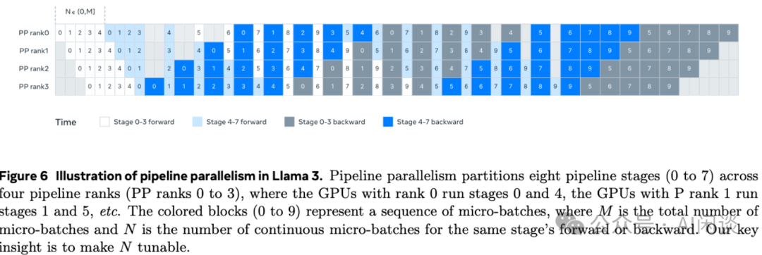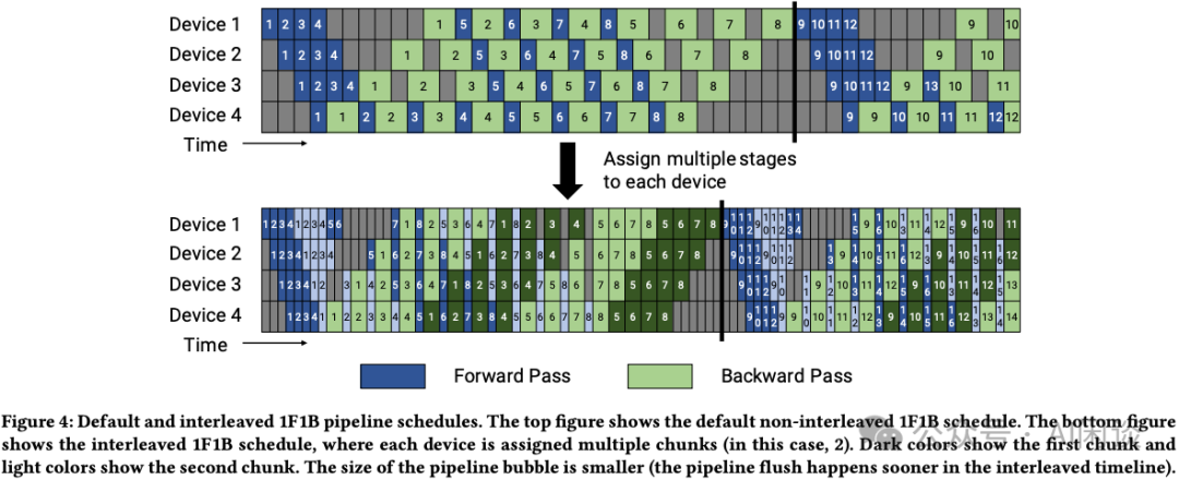 上述的 1F1B 过程并不需要 Forward 和 Backward 一样长,实际上,Backward 总是大于 Forward(大约 2 倍),此时 1F1B 依然是有效的调度机制。 PP 相比 TP 来说,只用在相邻的 PP Stage 间进行 P2P 通信即可,其通信次数、通信量相对较少,因此比较适合跨节点间通信;除此之外,从上图也可以推测出,增加梯度累加的次数,也就是 Mini Batch 的数量,可以较大程度降低 Bubble 率,梯度累加次数越大,Bubble 率越小。 3.3.3 Interleaved 1F1B 采用 PP 最需要关注的问题就是 Bubble 率,需要尽可能的利用流水线机制让所有设备处于工作状态,提升整体吞吐。 NVIDIA 在 [2104.04473] Efficient Large-Scale Language Model Training on GPU Clusters Using Megatron-LM 中提出的 Interleaved-1F1B 方案正是为了降低 Bubble 率。 如下图 Figure 4 所示为基于 1F1B 提出的 Interleaved 1F1B 调度方案。