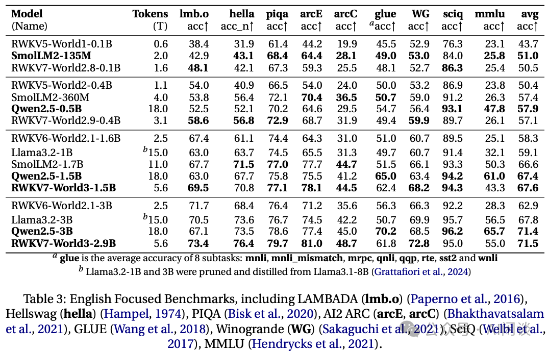 针对小规模模型,基于 Linear Attention 的 RWKV7 模型确实能获得与基于 Softmax Attention 相当的性能。