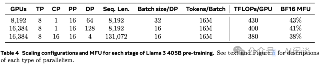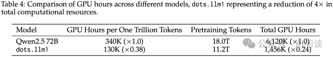 根据公式可以大概推出 DeepSeek V2 预训练的 MFU: MFU = (Token 数 * Ctoken) / (训练 GPU 小时数 * GPU FLOPs * 3600) 如下图 Table 4 所示 Qwen2.5 72B MFU 大约为 35.69%,dots.llm1 W142A14 MFU 大约为 18.15%: Qwen2.5 72B:(1T*72B*6) / (340K*989T*3600) = 35.69% dots.llm1 W142A14:(1T*14B*6) / (130K*989T*3600) = 18.15%