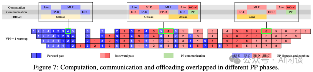最小化 EP 并行:由于 Attention Head 减半,Attention 计算时间变少,为了更好的实现计算和通信的 Overlap,需要最小化 EP 耗时,因此采用了 16EP 的最小化 EP 并行策略,这也放宽了负载均衡约束。细粒度重计算:对 LayerNorm、SwiGLU 和 MLA Up-proj、MoE Down-proj,已最小化计算开销并最大化显存节约。 FP8 存储激活:对于 MoE Up-proj 和 SwiGLU 等不敏感激活采用 FP8-E4M3 存储( 1 x 128 Tile 的 FP32 Scale)。潜在性能下降风险,未采用 FP8 计算。 激活 Offload:如上图 Figure 7 所示,采用了激活 Offload 的机制。