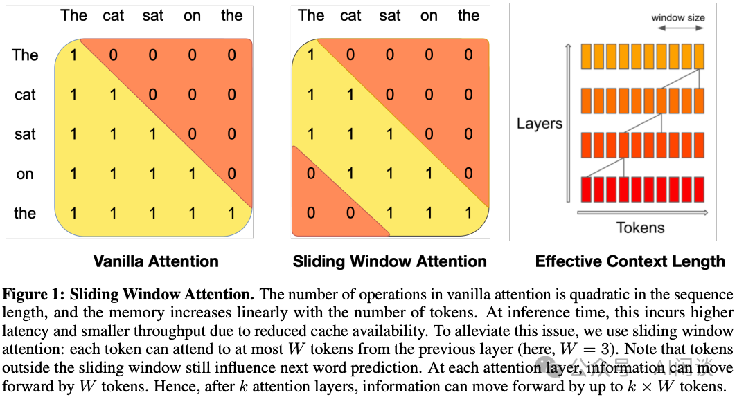 2.2.5 Sparse Attention 与 Linear Attention 类似,Sparse Attention 也是为了降低长序列的计算开销,只是方向不同。Sparse Attention 的主要动机是:Attention Score 是高度稀疏化的,只关注权重比较高的 Score 可以大幅降低计算复杂度并维持相当的精度。 Sparse Attention 在长序列 Inference 场景使用非常多,而预训练场景序列长度比较小,比较少使用。这里面比较早的工作是 Mistral 7B([2310.06825] Mistral 7B)中使用的 Sliding Window Attention,是 Sparse Attention 的一种特例。如下图 Figure 1 所示,其相当于每个 Token 只关注附近的 Token。