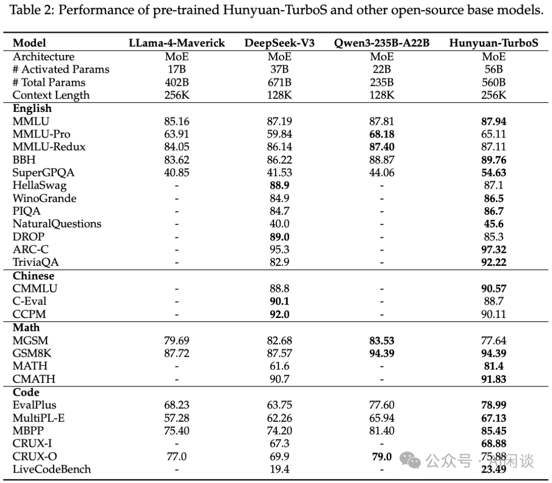 如下图 Table 2 所示,其效果也还不错,与 DeepSeek-V3、Qwen3-235B-A22B 相当: