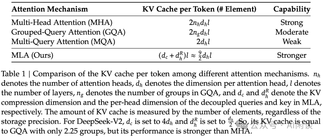 如下图 Table 1 可以看出,MLA 的 KV Cache 需求虽然依然大于 MQA,但明显优于 MHA 和 GQA,同时效果更好: