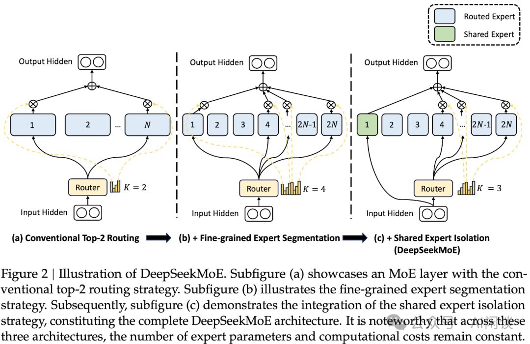 早期的 MoE 模型训练都比较保守,往往采用先训练 Dense 模型,然后通过 Upcycling 的方式扩展到 MoE 模型,比如上述的 Mixtral 8x7B 是由 Mistral 7B Upcycling 而来。在昆仑万维的 Skywork-MoE([2406.06563] Skywork-MoE: A Deep Dive into Training Techniques for Mixture-of-Experts Language Models)中也对相应方案有所探讨,并将 Skywork 13B Dense 模型扩展为 Skywork 146B 的 MoE 模型(16 个专家)。 2.3.2 细粒度 + 共享 MoE DeepSeek 团队在 DeepSeek MoE 的技术报告([2401.06066] DeepSeekMoE: Towards Ultimate Expert Specialization in Mixture-of-Experts Language Models)中提出了细粒度专家+共享专家方案,并且在后续模型中一直延续。如下图 Figure 2 所示,DeepSeek MoE 模型主要有两点改进: