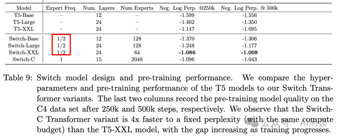 如下图 Table 9 所示,其中提到 Expert Freq 为 1/2,表明 MoE Transformer Layer 和 Dense Transformer Layer 各占 1/2:
