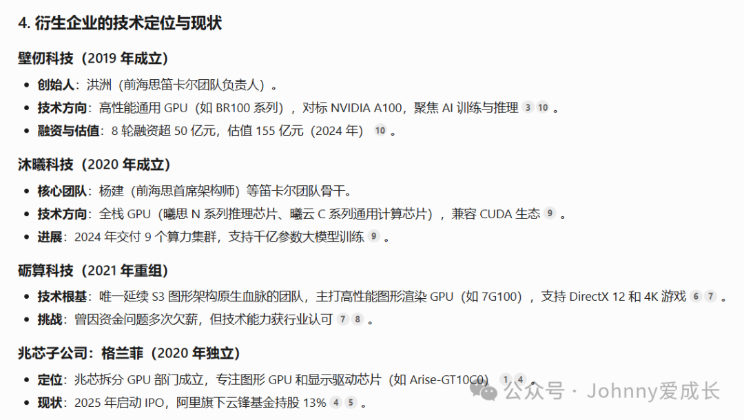 技术同源: 砺算、壁仞、沐曦、格兰菲均直接或间接继承 S3 Graphics 的 GPU 技术积累,但分化后路线各异: