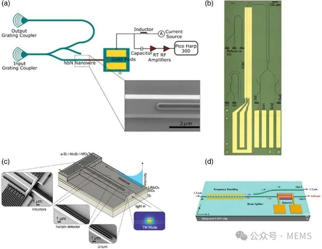 为了在TFLN上集成探测器,SNSPD在探测效率和时间抖动方面是最佳选择。Sayem等人展示了将NbN纳米线集成在TFLN波导上的成果,实现了46%的片上探测效率和32 ps的时间抖动(图3a)。除了NbN之外,NbTiN也可作为探测器材料,相关的TFLN波导集成已在文献中被报道(图3b)。Lomonte等人展示了NbTiN SNSPD,片上探测效率为27%,时间抖动为17 ps。在2024年,Colangelo等人通过在TFLN上集成MoSi纳米线,在1550 nm波长下实现了50%的片上探测效率和82 ps的时间抖动(图3c)。同年,He等人演示了在TFLN上异质集成非晶硅(a-Si)探测器(图3d),利用片上上转换技术,尽管外部效率较低,但在室温下也展现了潜在的单光子探测能力。