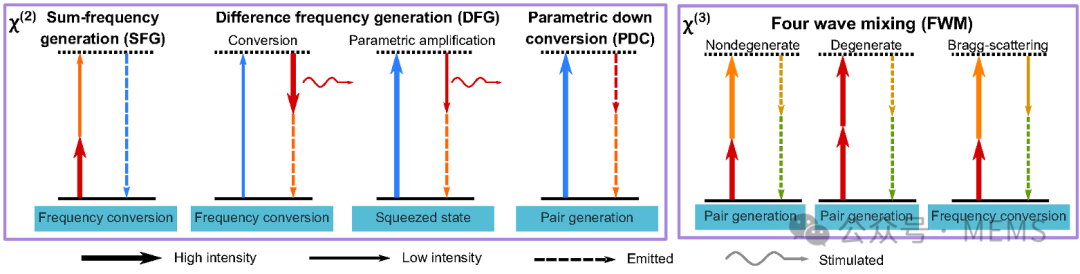 铌酸锂同时具备二阶和三阶非线性极化率,并且结合了较高的场约束能力,使得TFLN成为集成各种高效有源和非线性器件的理想材料之一。二阶和三阶非线性过程及其潜在的量子应用如图4所示。
