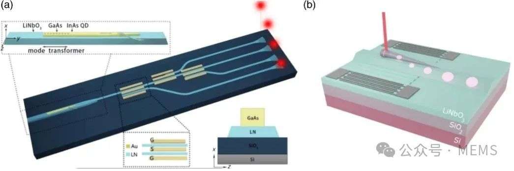 2018年,Aghaeimeibodi等人在TFLN平台上首次演示了量子点集成。他们在InP基质中制备了InAs量子点样品,并使用模式转换器将其耦合到TFLN波导中。Wei和Kesse在2021年的工作中进一步发展了这种方法(图2a)。他们将包含布拉格反射器的类似结构、渐变锥形和InAs/GaAs量子点发光源转移到TFLN光路上,并配备可调谐的定向耦合器,用于对发射的单光子进行路径复用。