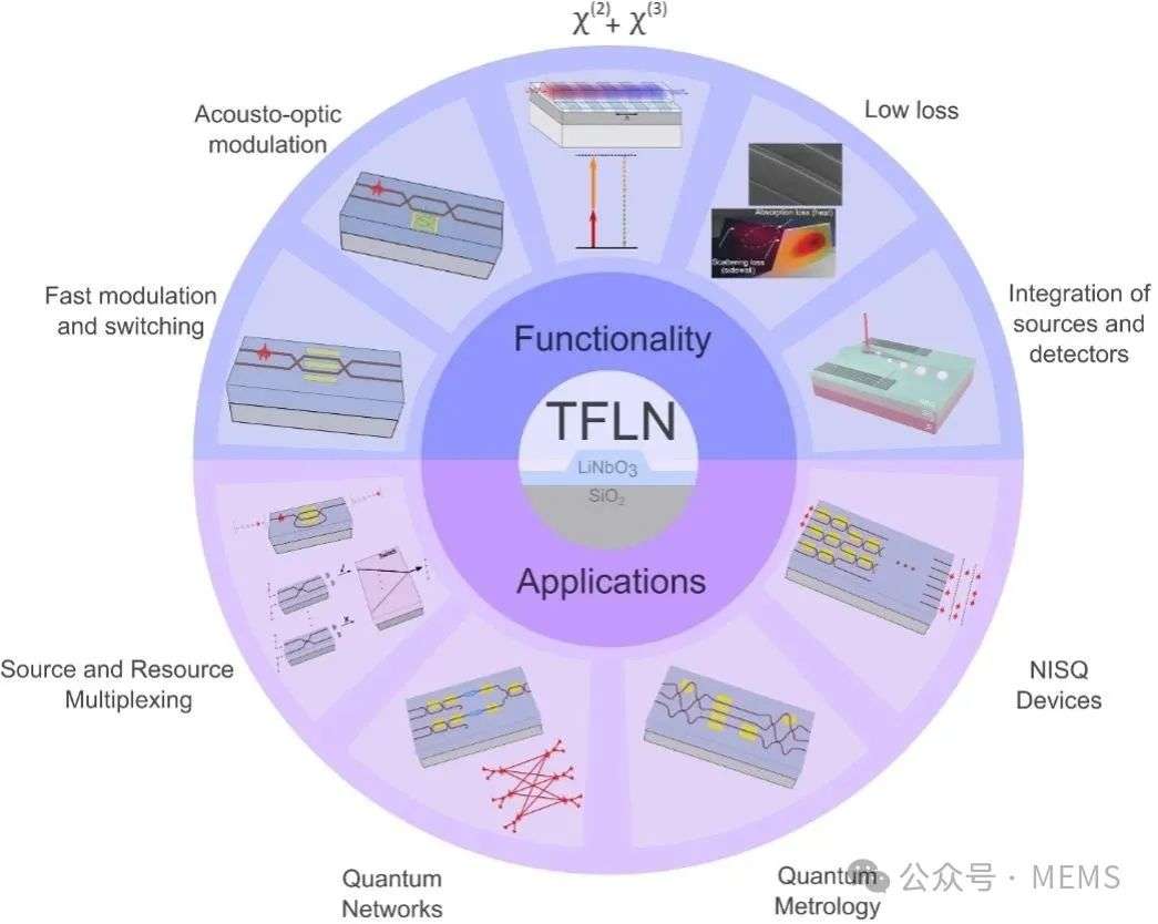 如今,TFLN平台已广泛应用于高性能器件的集成,涵盖了高速电光调制、电光频率转换、声光调制器、声波滤波器、光学与Kerr频率梳生成、非线性波长转换器、纠缠光子对源、换能以及光子量子技术等诸多领域。