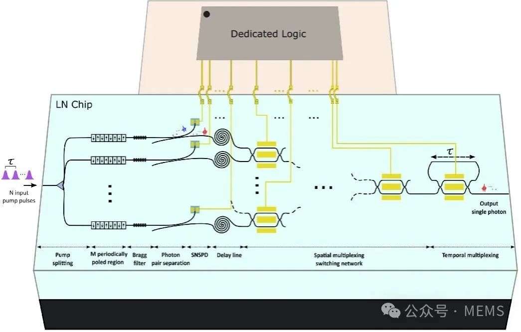 开发纯单光子源是量子光子学中的“圣杯”。实现周期性、近乎确定性的纯单光子生成的一个有前景的方法是对光子对源进行有源多路复用。设想的全片上、混合空间(M个源)和时间(N个模式)多路复用光子源需依赖若干关键组件(图5)。