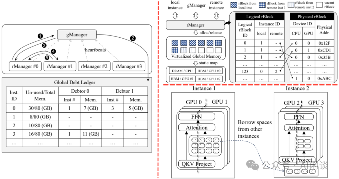 gManager 充当中心化管理器,维护所有实例的全局内存信息,如下图左图所示。每个实例定期向 gManager 发送心跳信号,发送有关其剩余可用内存空间的更新信息。gManager 利用这些信息构建了一个详细的表,称作 Global Debt Ledger。