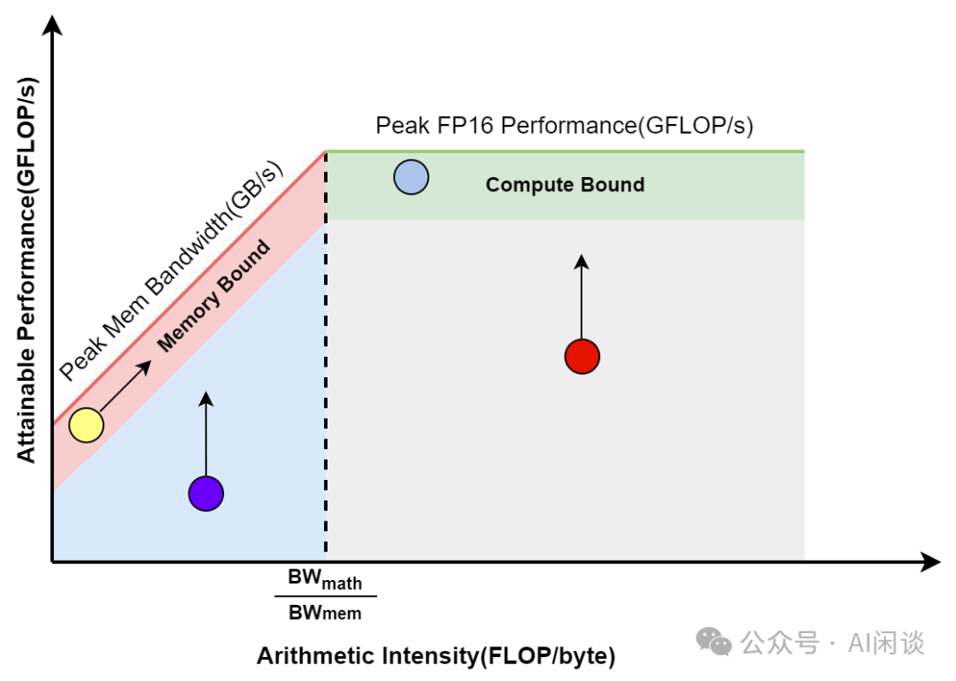 虚线左侧:访存多,计算少的场景为 Memory Bound。