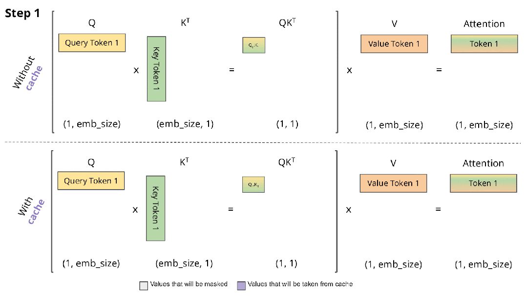 在 Decoding 阶段,Token 逐个生成,上述计算过程中每次都会依赖之前的结果,此时最简单的思路就是缓存之前计算过的中间结果(KV Cache)。在计算当前 Token 时直接从 KV Cache 中读取而不用重新计算,如下图所示,上面是没有 KV Cache的情况,下面是有 KV Cache 的情况:
