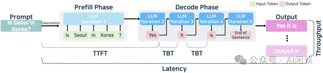 Decoding 阶段:从生成第一个 Token(A) 之后开始,采用自回归方式一次生成一个 Token,直到生成一个特殊的 Stop Token(或者满足某个条件,比如超过特定长度) 才会结束。假设输出总共有 N 个 Token,则 Decoding 阶段需要执行 N-1 次 Forward(robot, may, not, injure, a, human, being),这 N-1 次 Forward 只能串行执行,效率很低。另外,在生成过程中,需要关注的 Token 越来越多(每个 Token 的生成都需要 Attention 之前的 Token),计算量也会适当增大。