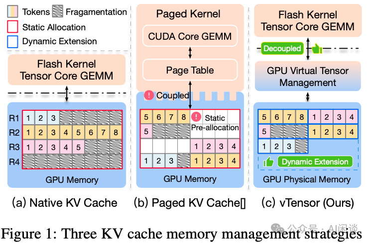 如下图 Figure 1 所示为 vTensor 与原始的 KV Cache 机制以及 Paged KV Cache 的区别,和 vAttention 类似,有 3 个好处: