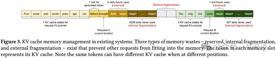 传统的 LLM 系统会为每个 Request 预先分配显存,如下图 Figure 3 所示,假设模型支持的最大序列长度为 2048,则最多会为每个 Request 预先分配 2048 个 Token 的显存空间。如果实际执行中的输入和输出包含 10 个 Token,则将有 2038 个 Token 空间的浪费(内存碎片),随着服务支持的 Batch Size 增加,这一问题会愈加明显: