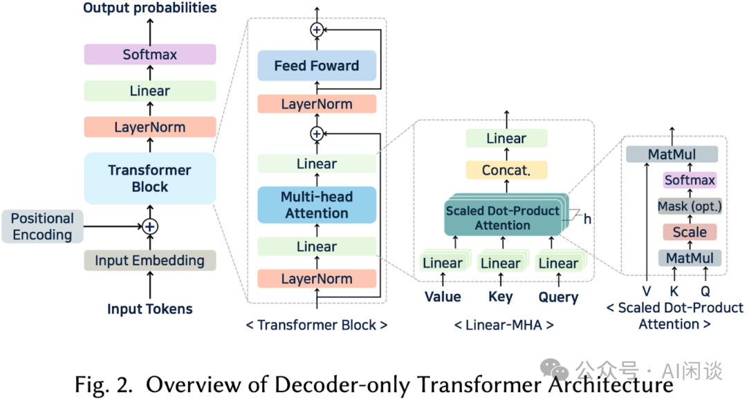 当前 LLM 基本都是 Decoder-Only 的 Transformer 模型,只不过会进行一些修改。比如对 Attention 的修改衍生出来 Softmax Attention 系列和 Linear Attention 系列。而对 FFN 的修改衍生出了 Dense 模型和 MoE 模型。如下图 Fig.2 所示为标准的 Decoder-Only LLM 模型结构: