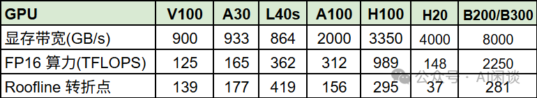如下图所示为常见 GPU 设备对应的 Roofline 转折点: