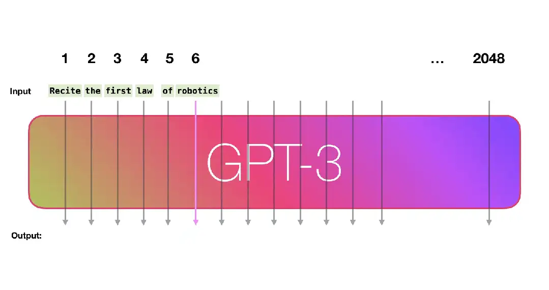 Prefill 阶段:根据输入 Tokens(Recite, the, first, law, of, robotics) 生成第一个输出 Token(A),通过一次 Forward 即可完成,在 Forward 中,输入 Tokens 间可以并行执行,执行效率很高。