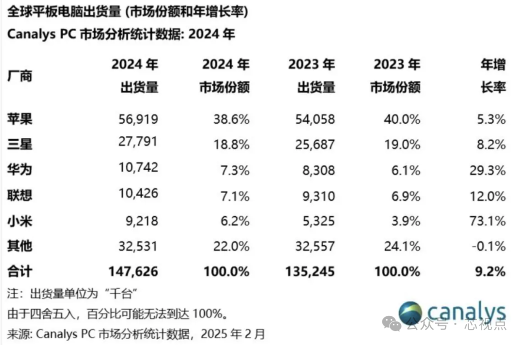 如图所示,据分析人士数据,联想平板去年出货量达1000万台,同比增长12%,在全球位列第四。其实在这个榜单中除了联想,其他厂商几乎都有自研芯片用到平板,大家怎么看联想这个决定呀?