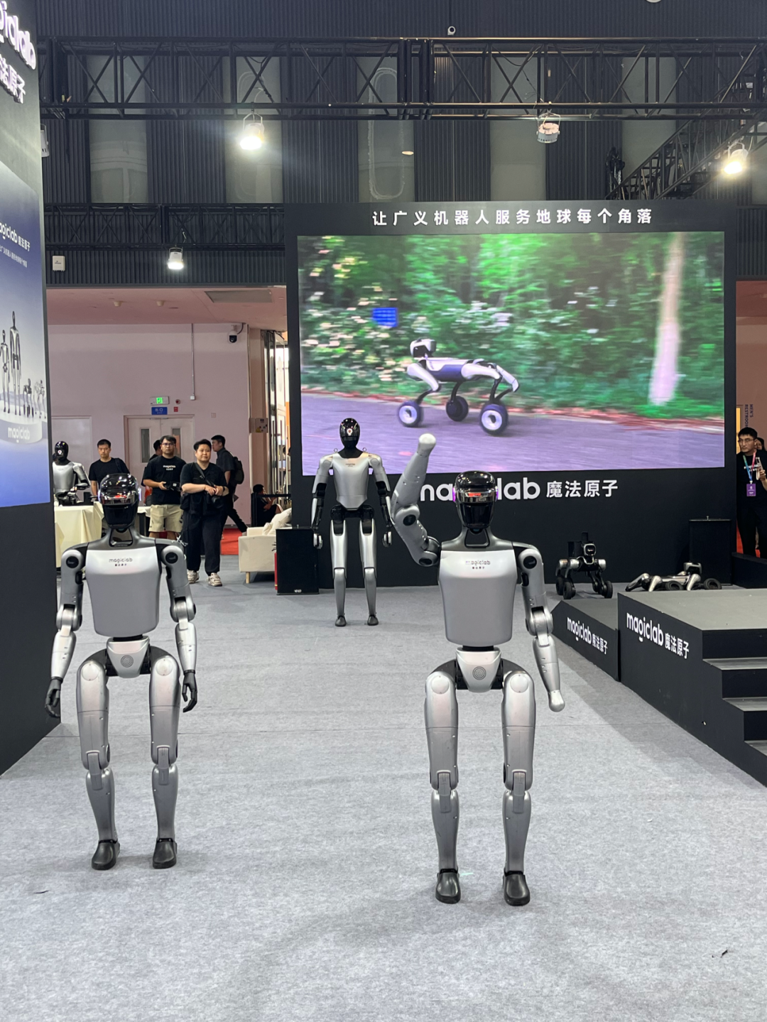 魔法原子则在此次WRC现场,诚意满满地带来了他们的机器人家族,包括全尺寸通用双足人形机器人“小麦”、高动态双足人形机器人MagicBot Z1、消费级四足机器人MagicDog、轮式四足机器人MagicDog-W,以及首次重磅登场的工业四足机器人MagicDog Y1。