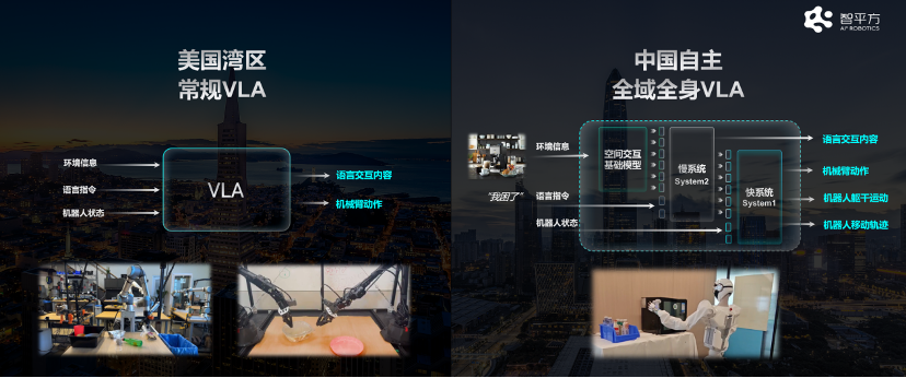GOVLA大模型由空间交互基础模型、慢系统和快系统三部分组成。其通过解析用户指令(如语音指令)、实时环境信息和机器人状态,双系统分工协作:慢系统System2负责复杂逻辑推理,任务拆解,输出语言交互内容;快系统System1输出机器人全身控制动作与移动轨迹,兼顾实时响应与复杂决策能力。值得一提的是,常规的VLA大模型只是输出机械臂动作,而GOVLA大模型首次提出输出全身控制和移动轨迹。