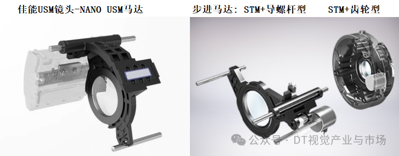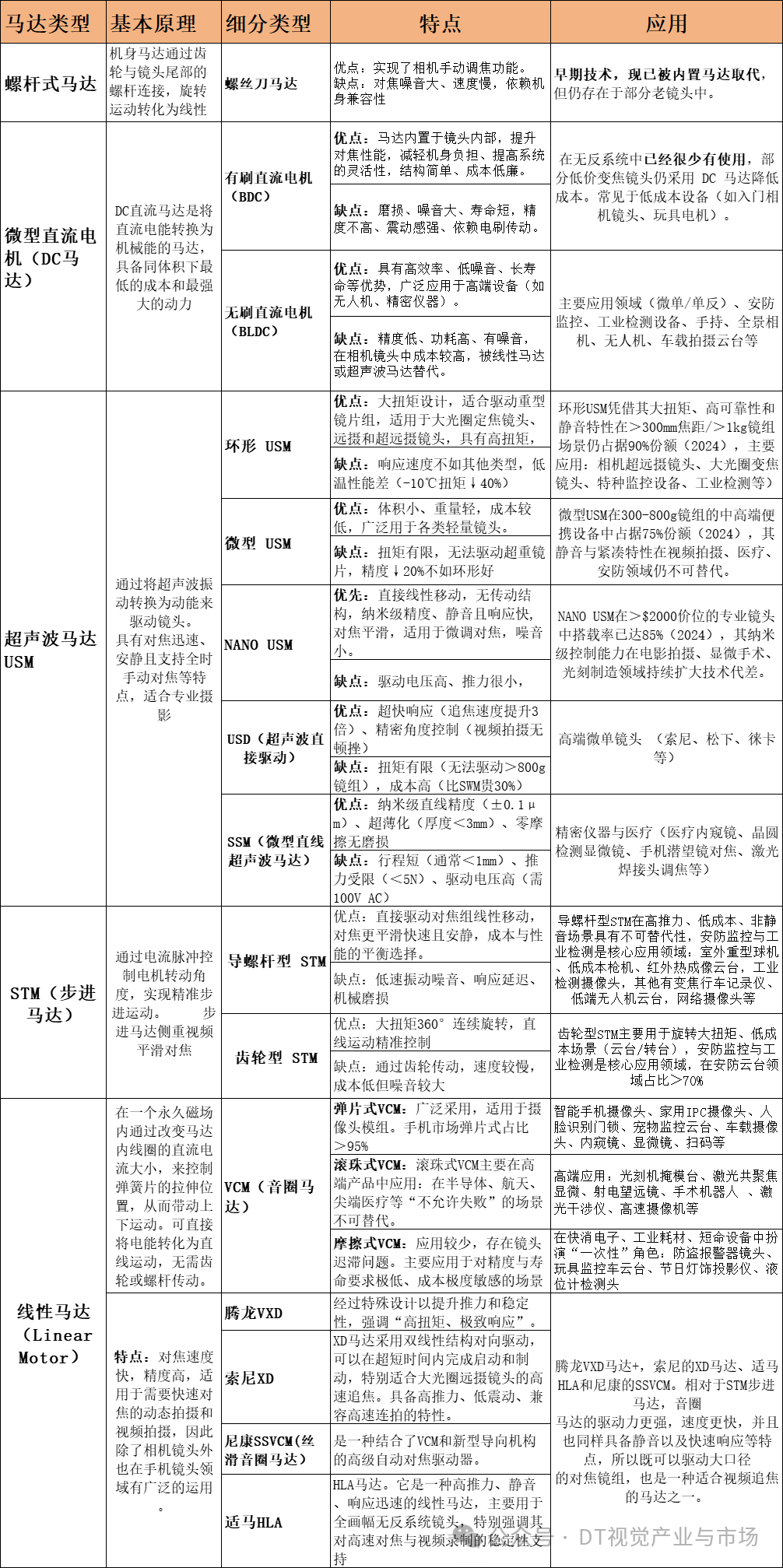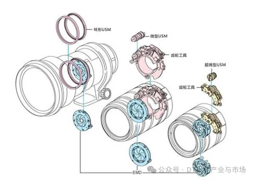 根据马达在相机镜头发展过程中来看,从早到晚依次是:螺丝刀马达(螺杆式对焦马达)、微型直流电机(DC马达)、超声波马达(USM)、步进马达(STM)、线性马达(Linear Motor)这几种马达类型。(步进电机、环形超声波马达、线性对焦马达、音圈马达(大驱动力型)),