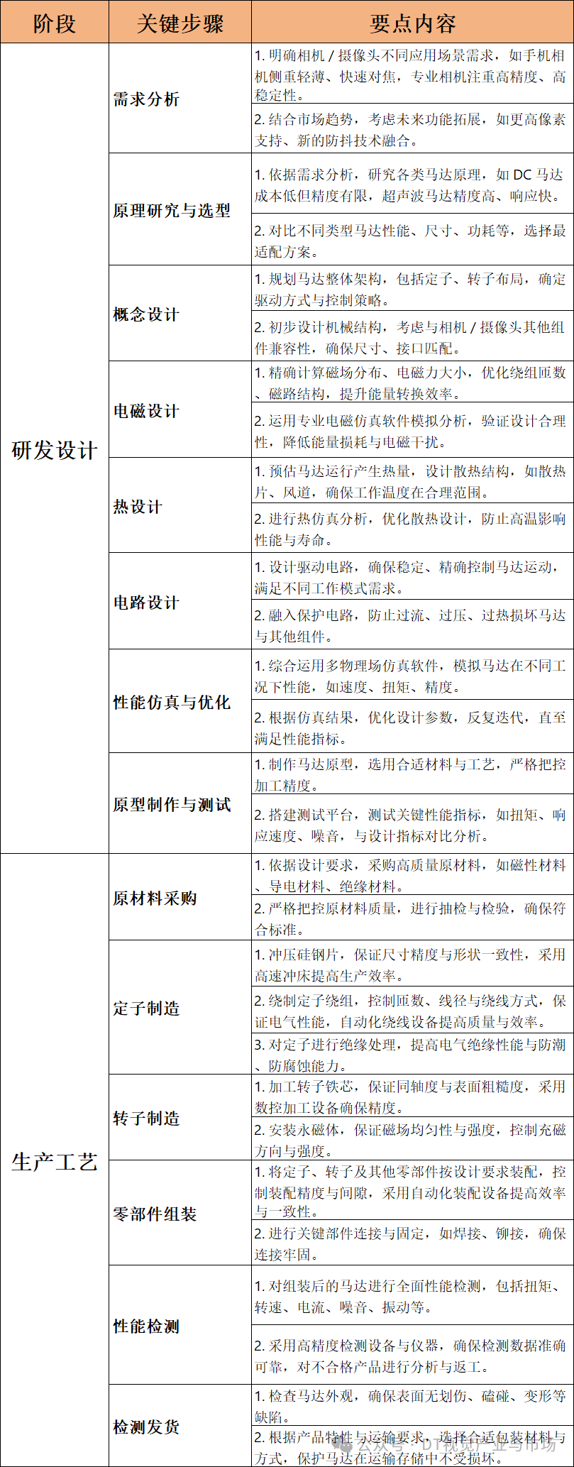 Part6:研发/工艺 以下是相机/摄像头用的马达(涵盖 DC 马达、超声波马达、步进马达、线性马达等类型)大概的研发设计及生产工艺流程,按阶段、关键步骤、要点整理的表格: