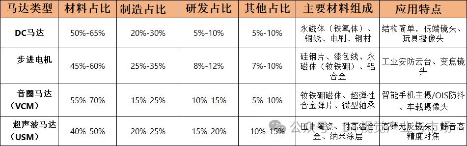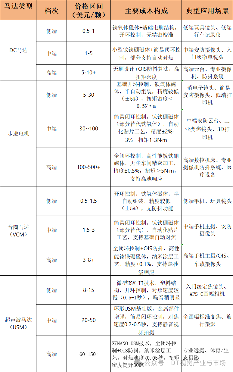 价格区间:DC马达是最基础的类型,价格低廉但精度较低;步进电机在性价比上不如其他马达,整体价格较高;音圈马达提供高性能同时价格低,性价比最高,超声波马达则主要用于高端应用,价格高。