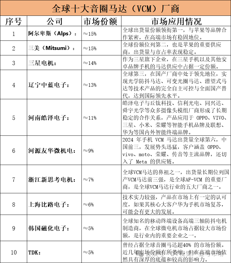 全球(VCM)音圈马达制造企业数量上百家,主要分布在日本、韩国、中国等区域。2024年全球市场格局:日本企业 (阿尔卑斯ALPS/三美Mitsumi/TDK等) 占据全球市场份额3~4成,并掌握先进技术和制造能力。韩国企业(三星电机SEMCO/ Jahwa磁化电子 /Hysonic/ LG-伊诺特/ SUNGWOO / JAP 等)占据全球市场份额3~4成,主要是三星电机和磁化,其他几家整体萎缩中。中国企业(中蓝电子/ 新思考/ 皓泽/ 友华微/ 比路等) 占据全球市场份额3~4成。中蓝电子(市占11.2%)、友华微(9.8%) 跻身全球前五。