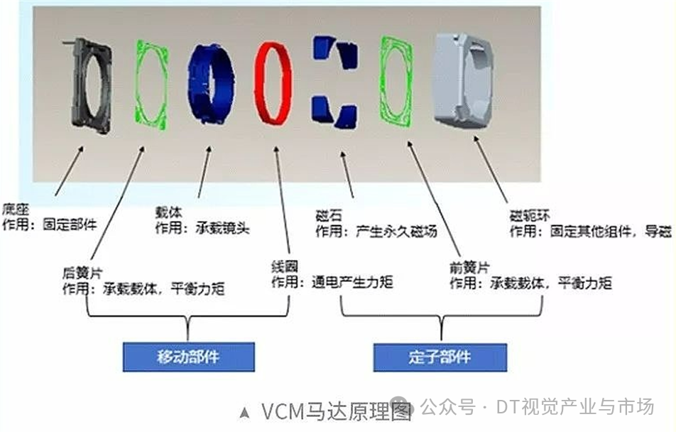 VCM因为原理和扬声器相似,所以叫音圈马达。,也是视觉模组用量最大、应用最广泛的马达类型,特别是摄像头模组上(智能手机,在笔记本、平板、运动相机、全景相机、医疗、汽车电子、智能监控IPC、工业机器人等摄像头)。
