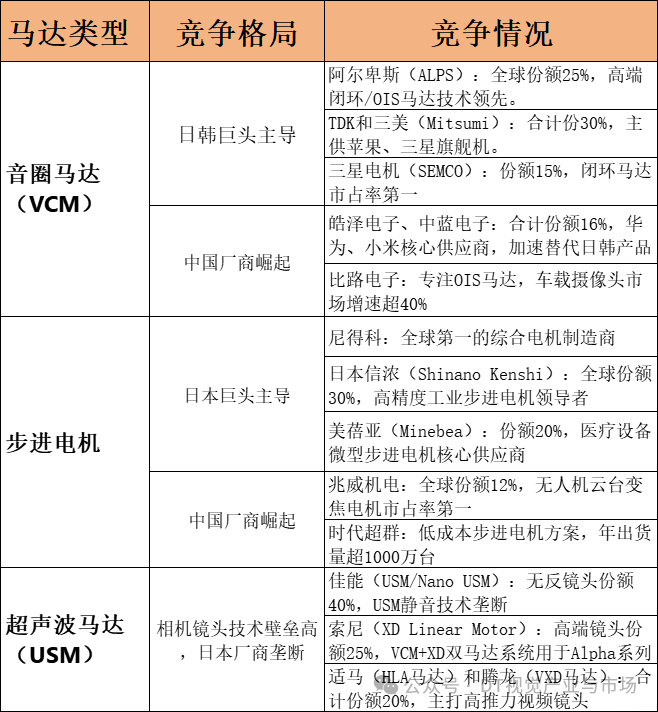 Part8:竞争格局 全球相机和摄像头用到的4种马达(DC马达、步进电机、超声波马达(USM)、线性马达)主要的头部玩家,总体来看高端的马达主要还是由日韩垄断,国产在中低端市场份额不断扩大,同步冲击高端产品技术和市场。