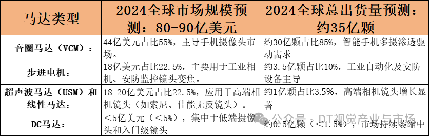 Part7:产业规模 由于马达应用广泛,基本上有70%~80%的电子设备都会用到,相机/摄像头用到的只是一部分的马达,根据相机和摄像头用到的4种马达(DC马达、步进电机、超声波马达(USM)、线性马达)的行业数据情况预测,2024年全球市场规模及竞争格局分析如下:总规模约80-90亿美元,总出货量约35亿颗。细分市场占比如下: