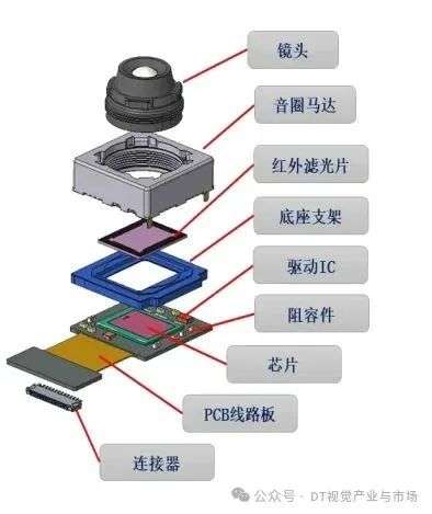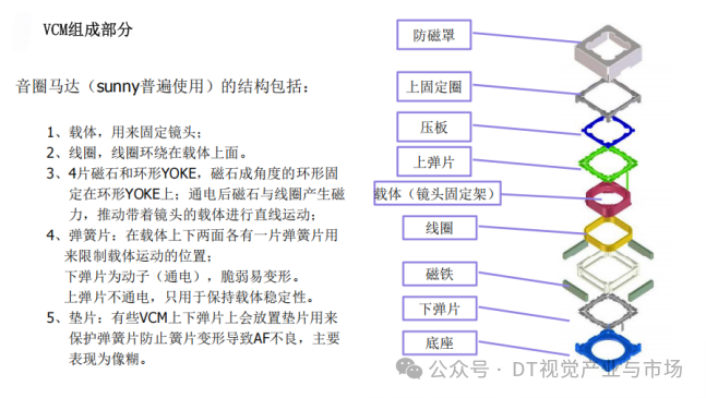 VCM在摄像头中的位置:音圈马达通常位于镜头与图像传感器之间,是连接镜头和其他组件的关键部分。