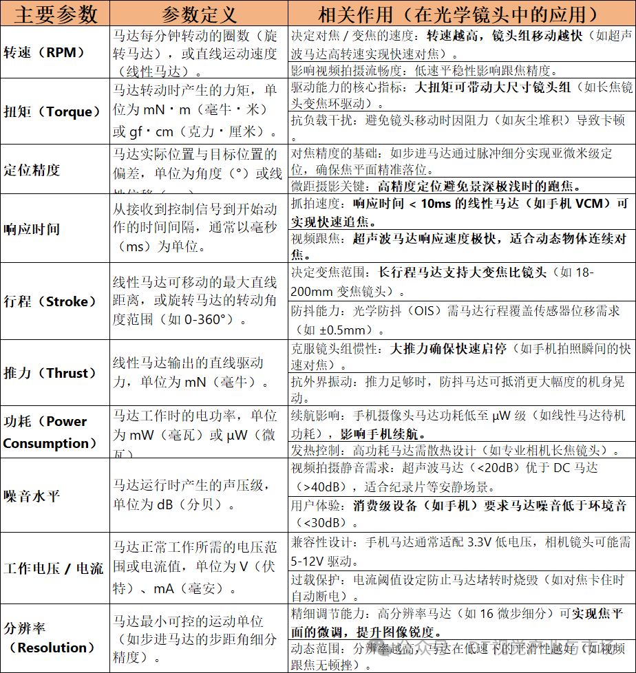 光学镜头摄像头中常用马达的核心参数整理表格: