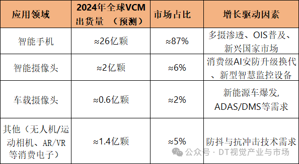 2024年全球智能手机出货量为12.2亿部(只是品牌手机,不包含白牌手机),同比增长6.4%,按照每台手机平均4个摄像头,通常主摄和长焦都要用到VCM,超广角/微距/前摄选配,一台四摄手机中至少要有2-3个摄像头需要VCM,2024年手机VCM马达出货量至少也有26亿颗,手机占VCM用量的87%以上。整个VCM市场实际出货量在30亿颗左右。