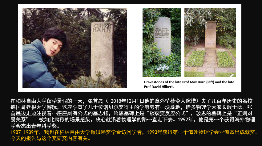 上面的照片是张首晟在读大学期间利用暑假到拥有几百年历史的名校——德国哥廷根大学游玩。这座孕育了几十位诺贝尔奖得主的学府旁有一块墓地,诸多物理学大家长眠于此。这一张是张首晟与哈恩墓的合影,在哈恩的墓碑上刻有“核裂变反应公式”,而在马克斯·波恩的墓碑上则刻着“正则对易关系”,这也是量子力学中基本的对易关系式。我想也是在这样肃穆的场景感染下,让他坚定了物理学这条道路上一直走下去。