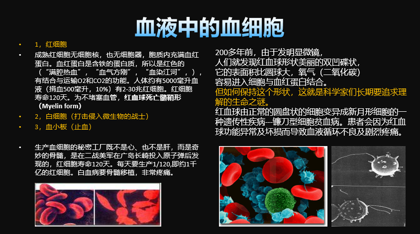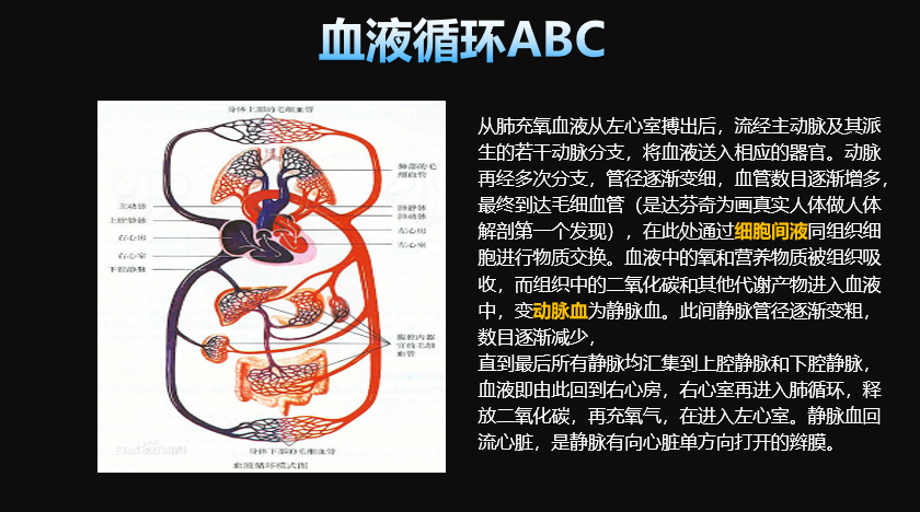 我们回到报告的课题。血球是我们人体里边最简单,但也是最重要的一种细胞。没有血液的流动,就没有生命。我们从图片中看到,红的代表动脉,黑的代表静脉,它们从心肺里循环得到氧气,通过大动脉、小动脉一直到微细血管,然后把氧气交给组织,这就代表了生命。然后从黑色的静脉这边,消耗完的二氧化碳又收回来,最后到肺里面呼吸出去。毛细血管的第一个发现者是著名的画家达·芬奇。