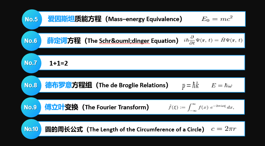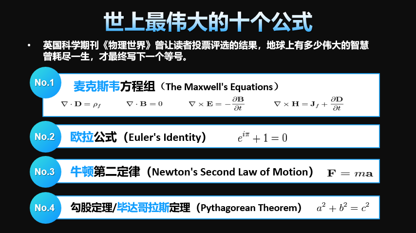 排名第二和第三的分别是欧拉公式和牛顿第二定律。当年我还在上中学的时候,牛顿第二定律就给我留下了深刻印象。然后是著名的爱因斯坦质能方程,相信大家都知道这个方程,但是人们往往很困惑,爱因斯坦是怎么想到把质量和能量结合起来的。其实,爱因斯坦最大的贡献是把时间和空间联系在一起,把能量和动量等价,然后这些公式就会被自动推导出。