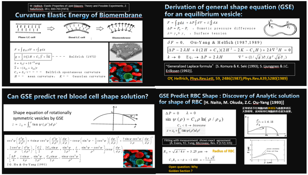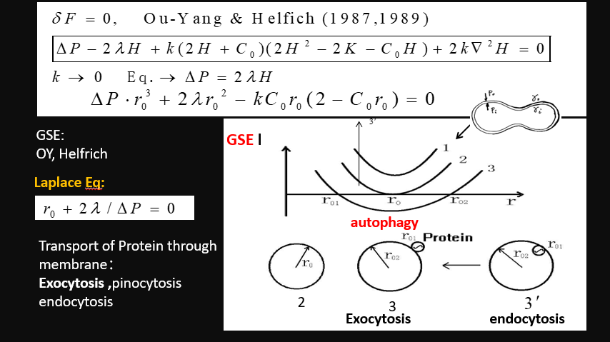 要决定一个生物膜的形状,取决于三种能,一个是赫尔弗雷奇弹性能的公式,还有一个ΔP和λ,这是拉普拉斯方程的公式,然后进行变分。Helfrich在1973年提出的能量公式时并没有进行进一步的计算,因为他不会微分几何。而我为什么会呢?不是我研究过微分几何,我也没学微分几何,但是我喜欢物理学,喜欢量子力学,喜欢广义相对论,所以一直都在学习,学习不同的版本。当我1987年过去,看到这个能量公式的时候,对它进行变分,最后求出来就这个方程。这方程从数学家来看是很漂亮的,因为它是等于倒三角的平方( ),这是电动力学才有的。麦克斯韦方程的势能就是这样一个方程,量子力学方程也有倒三角的平方( )项。