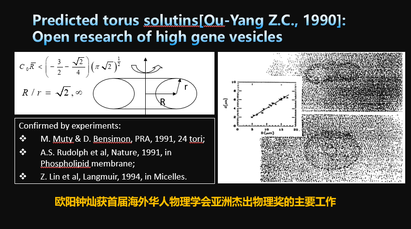 在得出红血球的解之后,当时又想到了其他的可能,红血球既然是双凹,你想象如果把它贴在一块,它就变成一个真的面包圈了,就是一个小圆转一个大圆。但这个是不是解需要去试,代入到方程里,得到一个很惊人的结果,就是不管半径多大,大圆半径与小圆半径的比一定等于 。这就是我自己很偶然的一个想法,后来发表在PRA上。因为它是个纯数学问题,开始我投PRL,PRL的编辑说你这个只是一个数学游戏,最好交到PRA。交到PRA后,他说你这个不重要,只能发表在最基本的、最初等的《Brief Report》期刊的短报上,我也同意就发表了。但是没想到发了以后,第二年,世界上很多国家的实验室都观测到这种现象,在生物膜里边有这种环形泡。法国人Bensimon,说在他的实验中真看到了24个环形膜泡,不管多大多小,它的半径比都是 ,这让我很高兴。