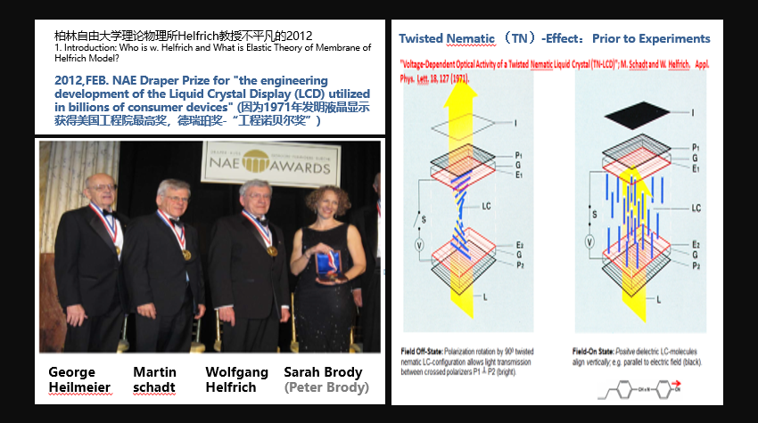 冯元桢原来是力学家,后来转去研究生物力学,2020年刚刚去世,享年100岁。他在国内外都有很多学生,这本书是他写的《生物力学》。他在书中写道,尽管他研究生物力学,但是红血球的形状他在1984年没有解决。日本很有名的生物力学家岗小天也特别指出,有关双面凹圆盘的形状机理并不明了。那么这个问题最后被谁解决了呢?这个人叫Helfrich(沃夫冈·赫尔弗雷奇),也是柏林自由大学的,他是我洪堡奖学金的导师,但是他并不研究红血球,他研究现在大家都在用的液晶显示,液晶显示就是他发明的。他在1971年写了一篇文章,把液晶夹在两片玻璃当中,在他们之间加电压液晶分子会转动,这就变成了一个可控的窗帘。2012年美国工程院的德瑞珀奖,我们也叫它诺贝尔工程奖,颁给了液晶显示发明的四个人。