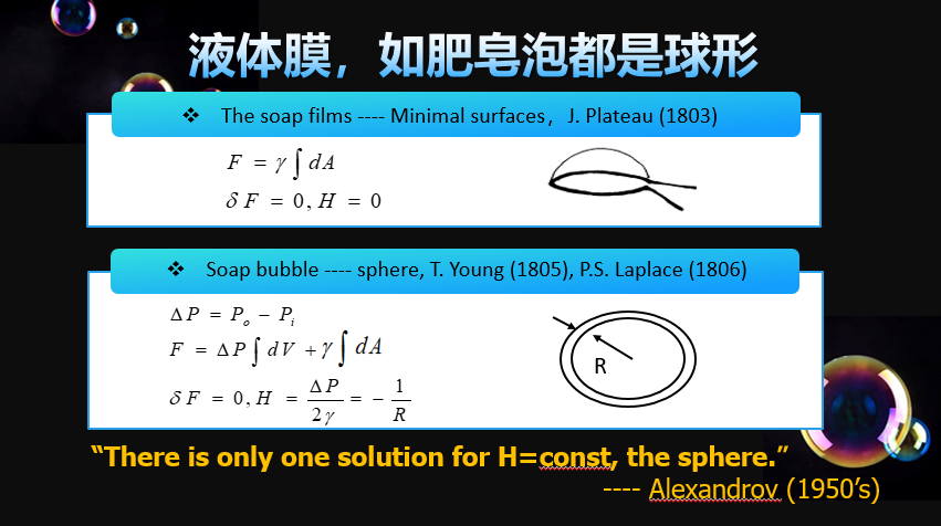 对这些现象,很多人都在研究。大家都吹过肥皂泡,肥皂泡吹出来,它的功方程使它表面能量最小,得到的方程是一个平均曲率。通过微分几何知道,任何一个曲面,将它分割成很多细切片,会发现有的半径小,有的半径大,半径的倒数就叫曲率。将最大的曲率和最小的曲率相加除以二就是平均曲率,得到的平均曲率等于常数,ΔP就是两边的压差,你吹肥皂泡就是里边的压力比外面大,还有常用的水银计,里面的水银表面是凹的,有的矿泉水里有杂质,它的表面就是凸的。解释这些问题都是用这个方程,它叫做拉普拉斯方程,但是要从理论上证明这样的一个闭合的泡只有球是很困难的。